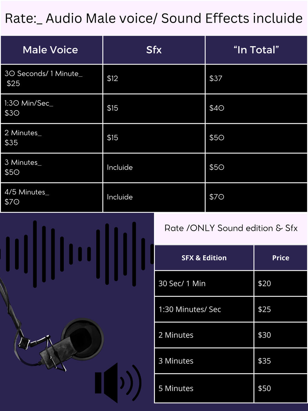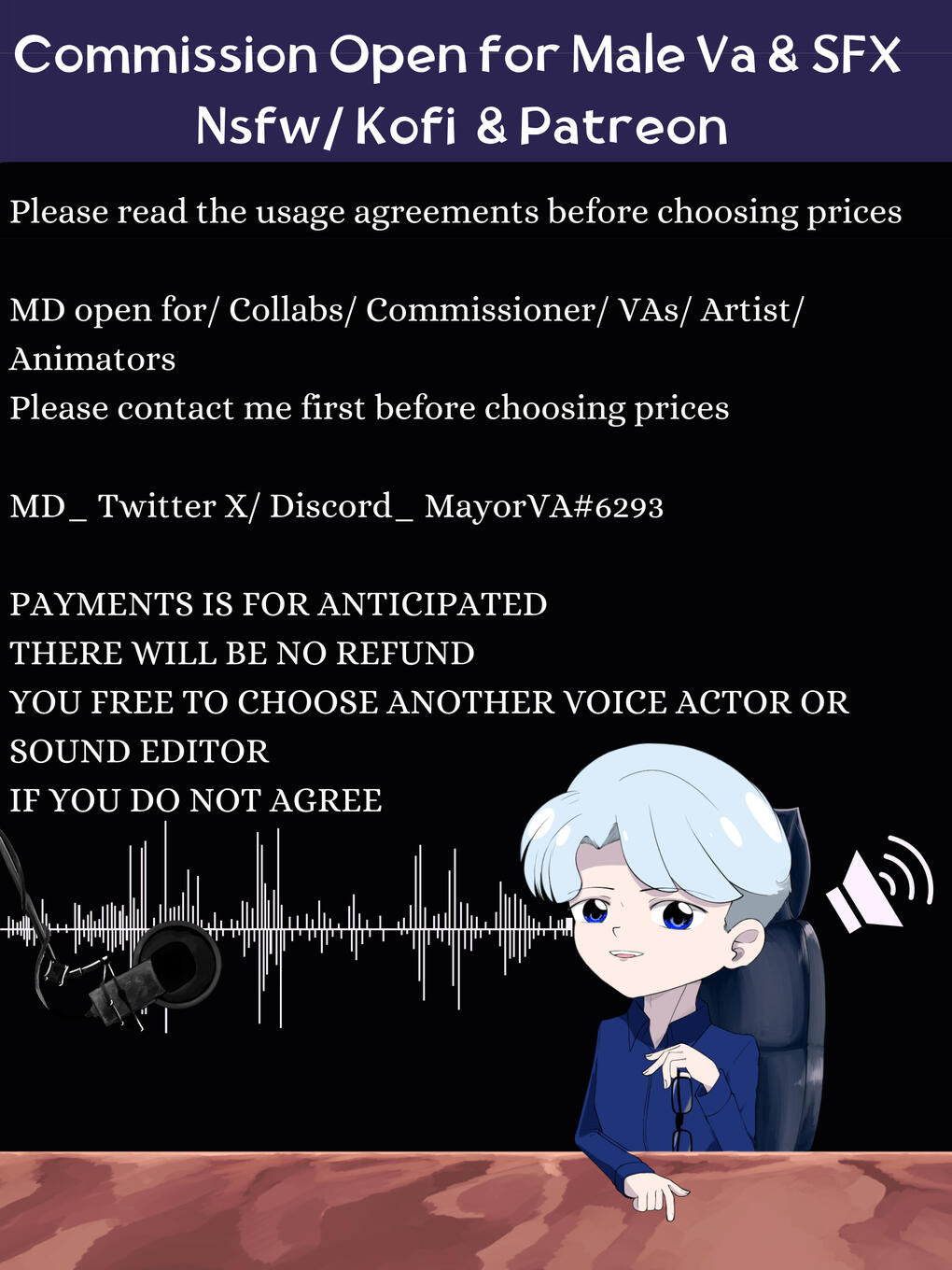 I do voice for male characters/ young/ Shy/ Adult/ Straight/ Gay/ Bi Etc… I do voices for characters of any age “Only if its SFW” /I do voices for lew characters NSFW “Only characters who are 18 years old” /I will not give voices to children’s /Incest “Reconstructed family YES”/ I don't do private audiosThe same terms will apply to SFX/ Sound edition/ Audio Mix